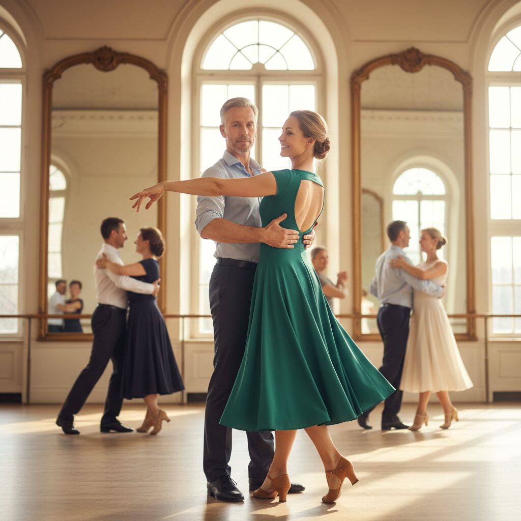 社交ダンスでは専用のダンスシューズを使用し、ヒールの高さや靴の形状が動きに大きく影響します。また、練習する床の状態も身体への負担に関係しています。適切なシューズと床環境は、回転や移動をスムーズにし、効率的な動きを可能にします。