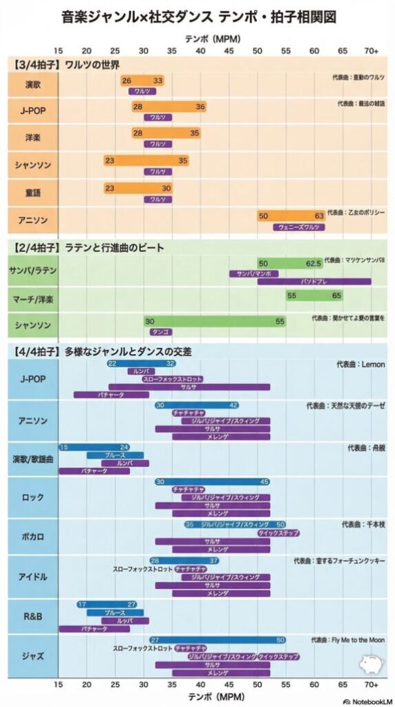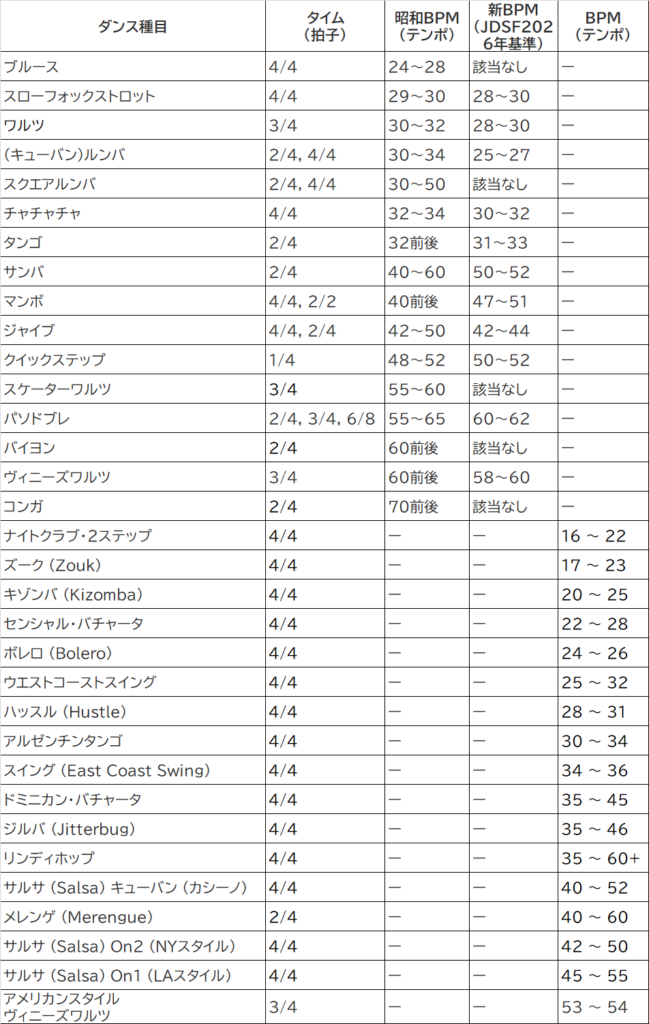 ※参考で、種目毎のテンポ(1分間あたりの小節数)一覧